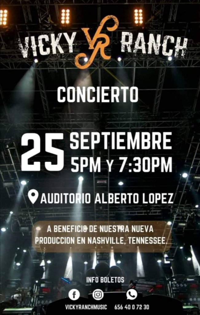 Ven y disfruta una tarde de Country con el primer concierto de «Vicky Ranch» este 25 de septiembre en el auditorio Alberto López del Centro Cultural Tamaulipas; habrá dos funciones 17:30 y 19:30 horas.