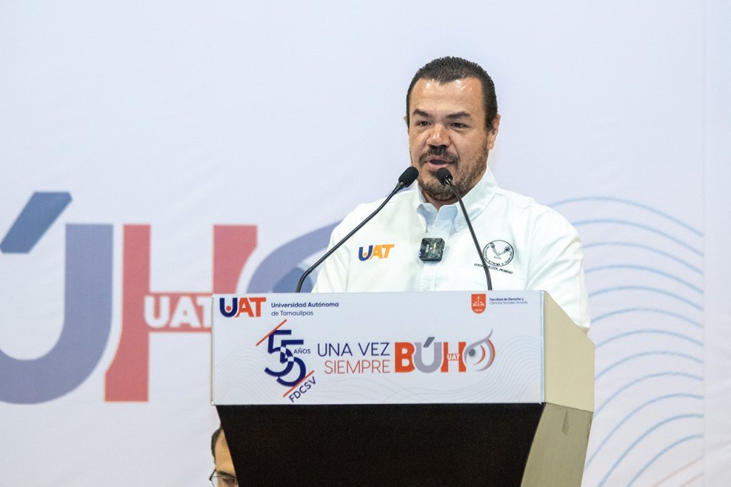 El C. P. Guillermo Mendoza Cavazos, Rector de la Universidad Autónoma de Tamaulipas (UAT), presidió la ceremonia inaugural de la Feria Estatal de Proyectos e Iniciativas Ciudadanas «Juventudes Transformadoras», organizada por la Facultad de Derecho y Ciencias Sociales Victoria (FDSCV) en el marco de su 55 aniversario.