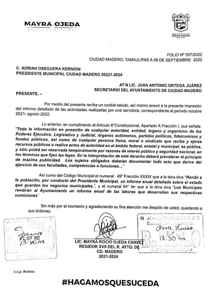 Este documento, tiene la información a detalle de su trabajo realizado en el Ayuntamiento de Ciudad Madero desde el pasado 1 de octubre del 2021 a la fecha, en la décimo séptima regiduría del H. Cabildo.