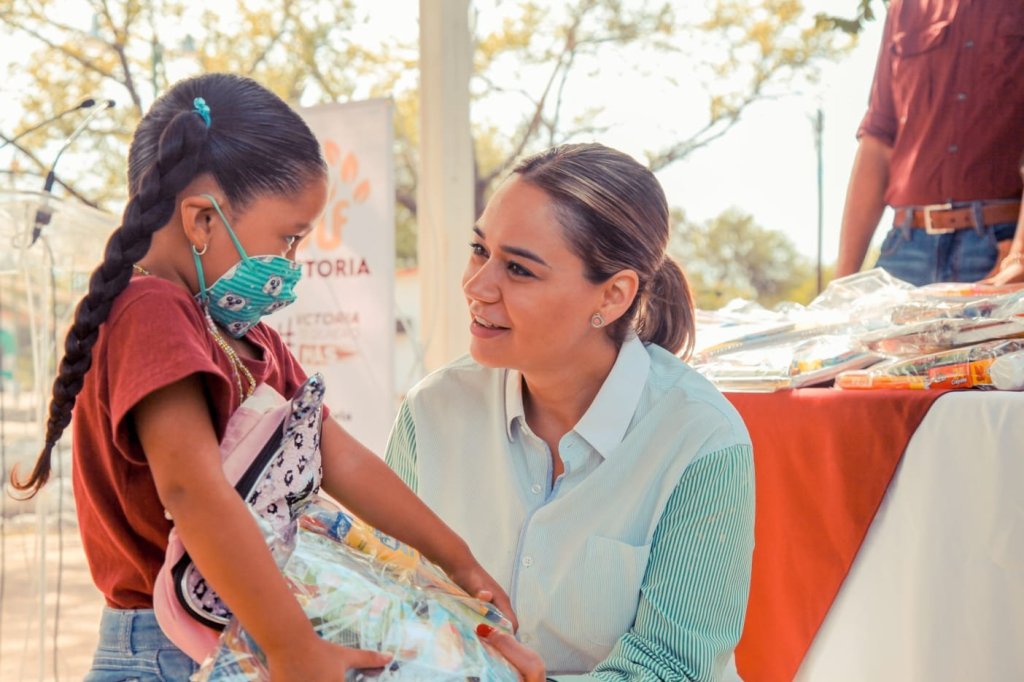 Con la voluntad que la caracteriza, y en compañía del presidente municipal de Victoria Eduardo Gattás Báez y personal de voluntariado, visita colonias y ejidos para entregar útiles escolares, mochilas y calzado a alumnos de planteles de educación básica.