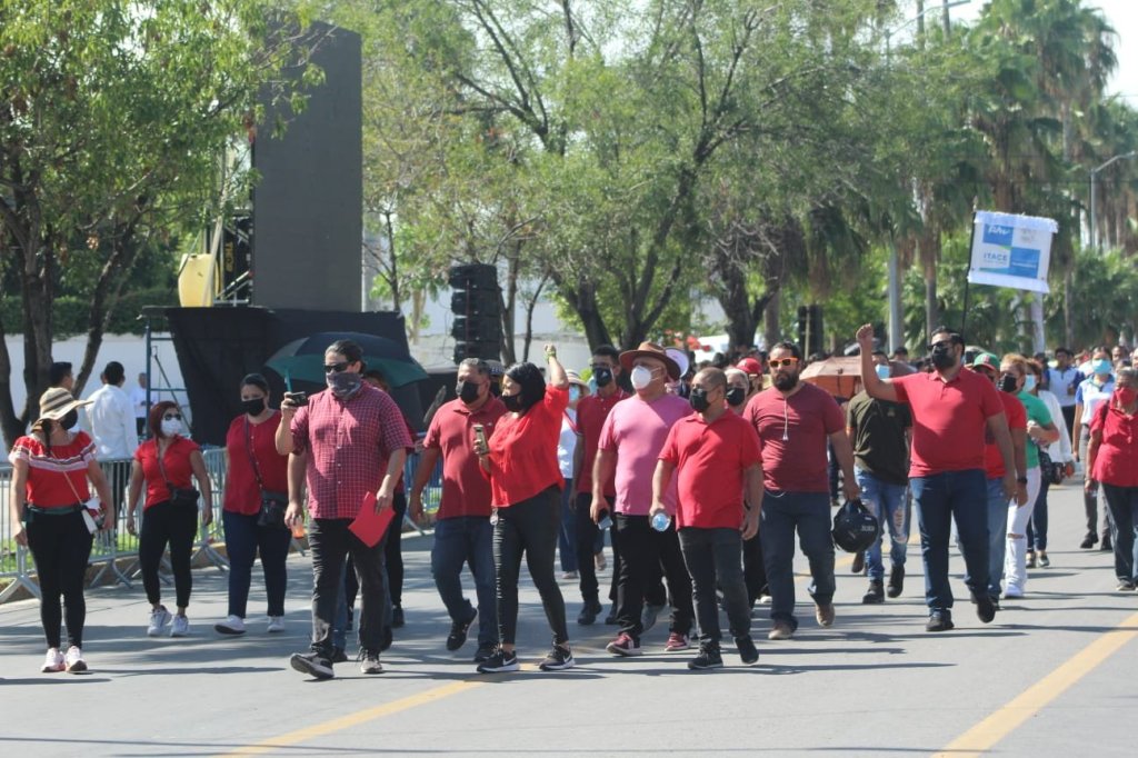 Vestidos con playera roja y pantalón negro, colores de huelga, los profesores y personal admirativo se incorporaron al desfile, no faltó el aprontado que intentó retirarlos, sin embargo pudieron desfilar y entregarle un pliego petitorio a García Cabeza de Vaca.