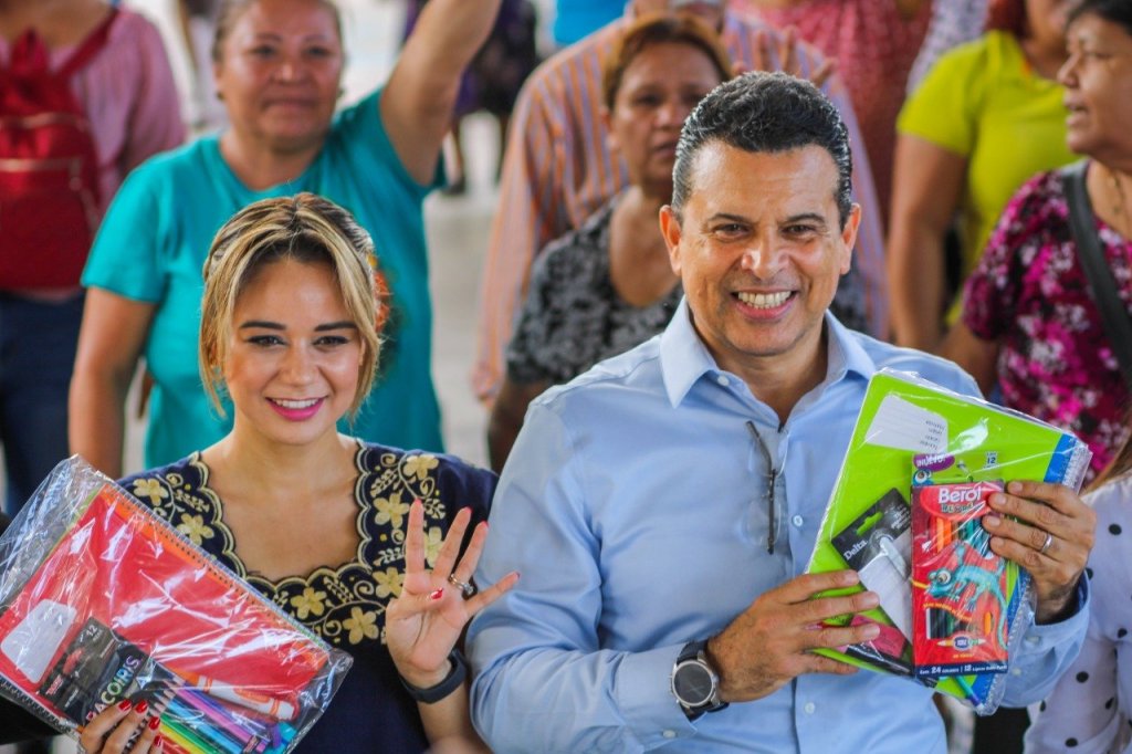 Cd. Victoria.- En escuelas del Ejido La Presa, la presidenta del Sistema DIF Victoria, Sra. Lucía Rodríguez de Gattás y el alcalde Eduardo Gattás Báez entregaron útiles escolares básicos a través del programa municipal “Pasos por la Educación”.