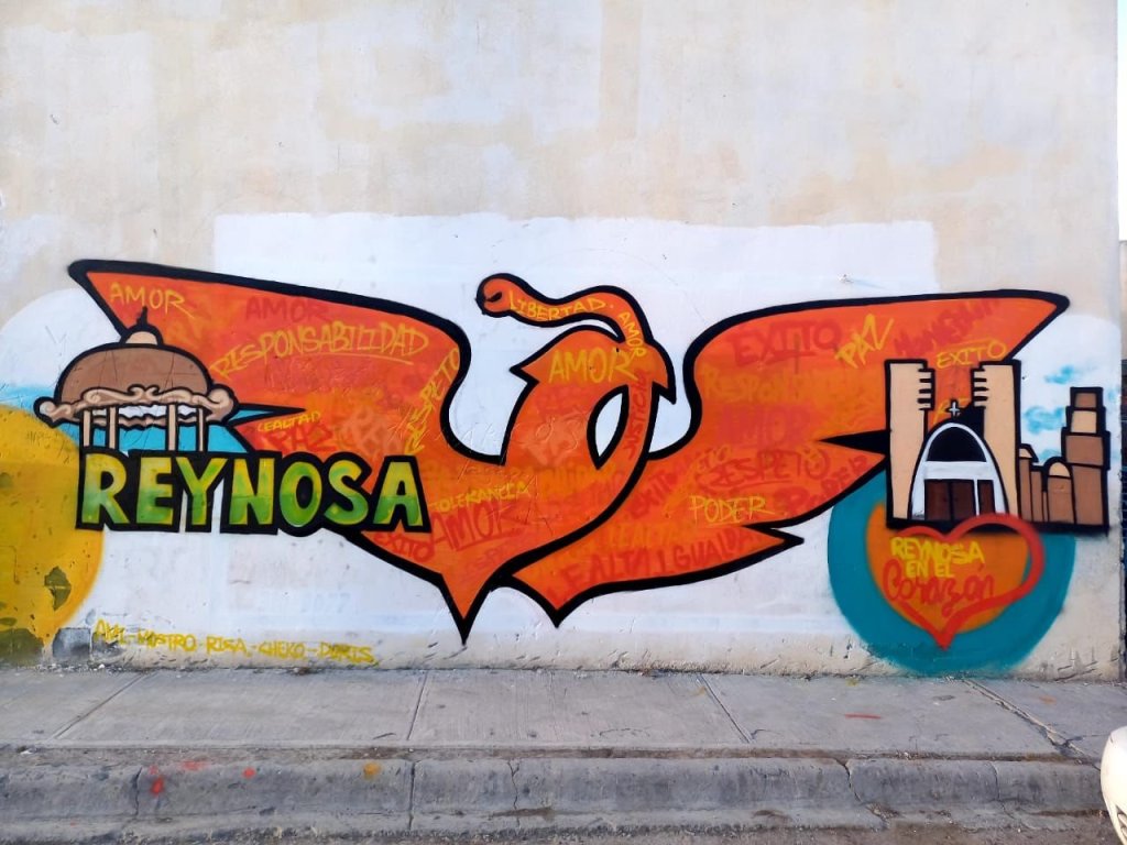 Acompañados de la delegada municipal de Reynosa Doris Cantú Robles, artistas locales participaron en Pinta el Futuro con un diseño más tradicional en lo que respecta al águila naranja, pero con los detalles de los diferentes valores que decidieron incluir dentro del contorno, junto con la imagen a los costados de la Catedral y kiosko de la plaza principal de dicha ciudad, acompañados con la leyenda “Reynosa en el Corazón”.
