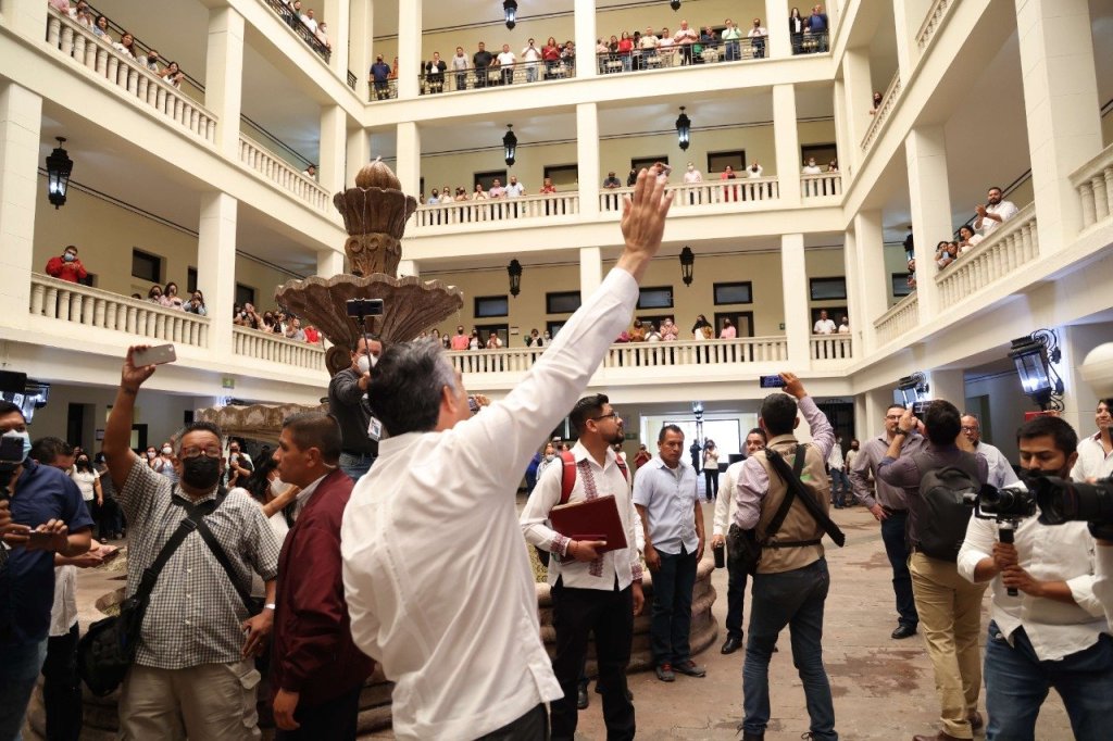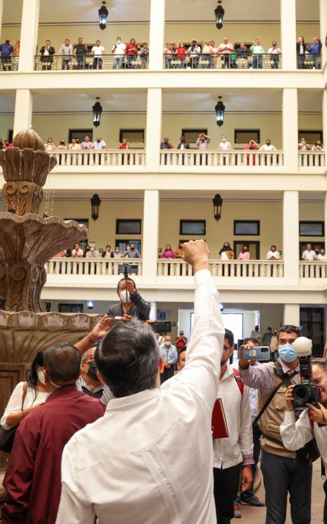Ciudad Victoria, Tamaulipas, 3 de octubre de 2022 – Cuando la puerta de palacio se abrió, el grito surgió espontáneo, «Sí se pudo!, Sí se pudo!, yo voté por Américo Villarreal».