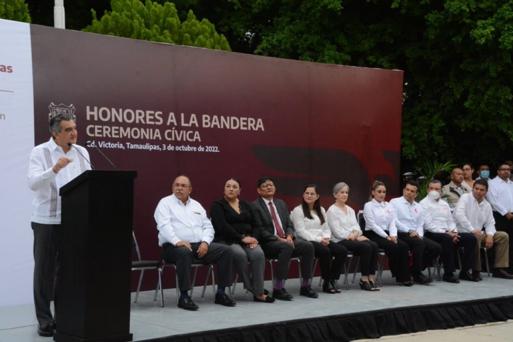 Cd. Victoria, Tamaulipas, 3 de octubre de 2022.- El gobernador Américo Villarreal Anaya presidió la primera ceremonia cívica de honores a la bandera y ante la estructura educativa del Estado, llamó a unir esfuerzos para combatir el rezago en el sector y que en Tamaulipas la educación sea verdaderamente transformadora.