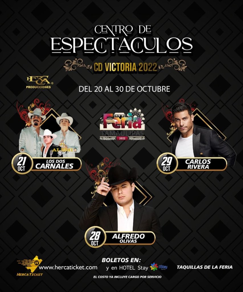 Los primeros artistas en anunciar son LOS DOS CARNALES que se presentarán el viernes 21 de octubre, ALFREDO OLIVAS el viernes 28 de octubre y CARLOS RIVERA el día sábado 29 de octubre .