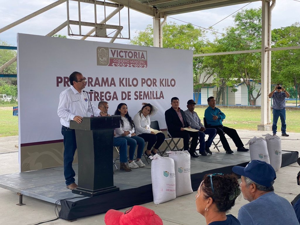 En representación del alcalde de Victoria, el Secretario de Desarrollo Rural Víctor Manuel Gómez Pérez dirigió junto a autoridades estatales del sector la distribución de 2 mil kilos de grano de frijol negro JAMAPA como parte del programa kilo por kilo que coordina el organismo Seguridad Alimentaria Mexicana la SEGALMEX.
