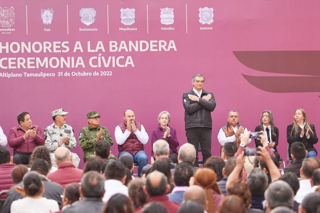 Al iniciar su segundo día de actividades en Tula, con la ceremonia cívica de honores y acompañado por su esposa María de Villarreal, presidenta del DIF estatal, el gobernador quien aseguró, ser amigo y aliado de los tultecos llamó a reflexionar sobre el gran momento que vive Tamaulipas, “para que nuestra esperanza permanezca viva, fuerte y brillante».