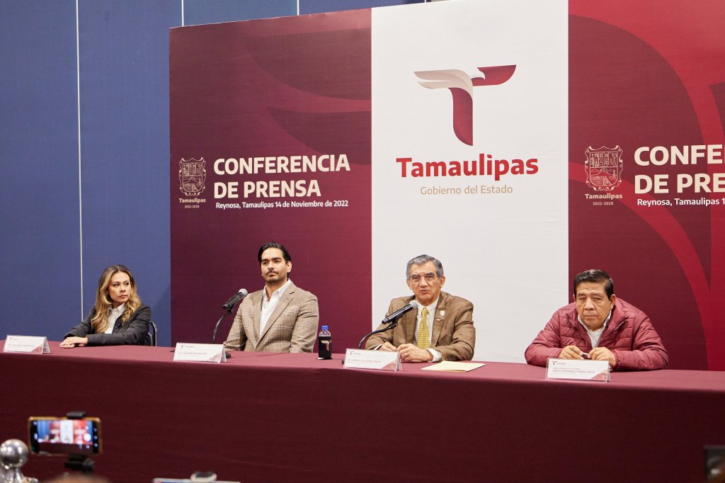 Acompañaron al gobernador en la conferencia de prensa el alcalde de Reynosa, Carlos Peña Ortiz; el secretario de Seguridad Pública, Sergio Chávez García y la Consejera Jurídica del Estado, Tania Contreras López.