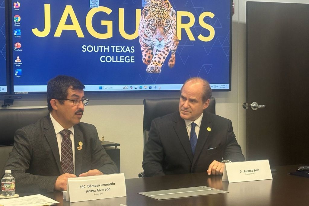 El MVZ Dámaso Leonardo Anaya Alvarado, rector de la Universidad Autónoma de Tamaulipas, y el Dr. Ricardo Solis, presidente del South Texas College (STC), firmaron un convenio de colaboración internacional en materia académica y científica.