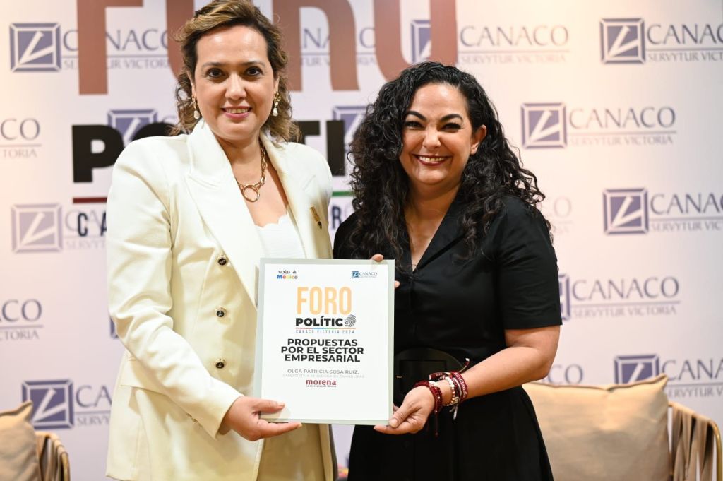 Ciudad Victoria.- Ante empresarios de todos los rubros económicos de la capital de Tamaulipas, la candidata de Morena al Senado Olga Patricia Sosa Ruíz, hizo la presentación de los ejes en materia de empleo, economía y propuestas de campaña, como parte del foro político organizado por la Cámara Nacional de Comercio, Servicios y Turismo que preside Greyci Ethel Robles Barajas.