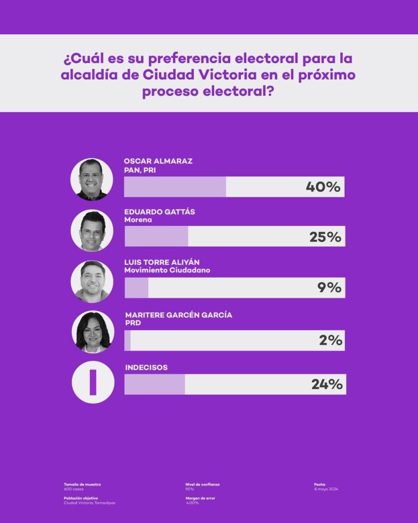 Cd. Victoria, Tam.- Para la conocida casa encuestadora Voto Mx (referente de medios de comunicación nacionales), en su más reciente estudio de opinión el puntero en las encuestas para la alcaldía victorense es Oscar Almaraz Smer, quien en esta medición alcanza los 40 puntos.
