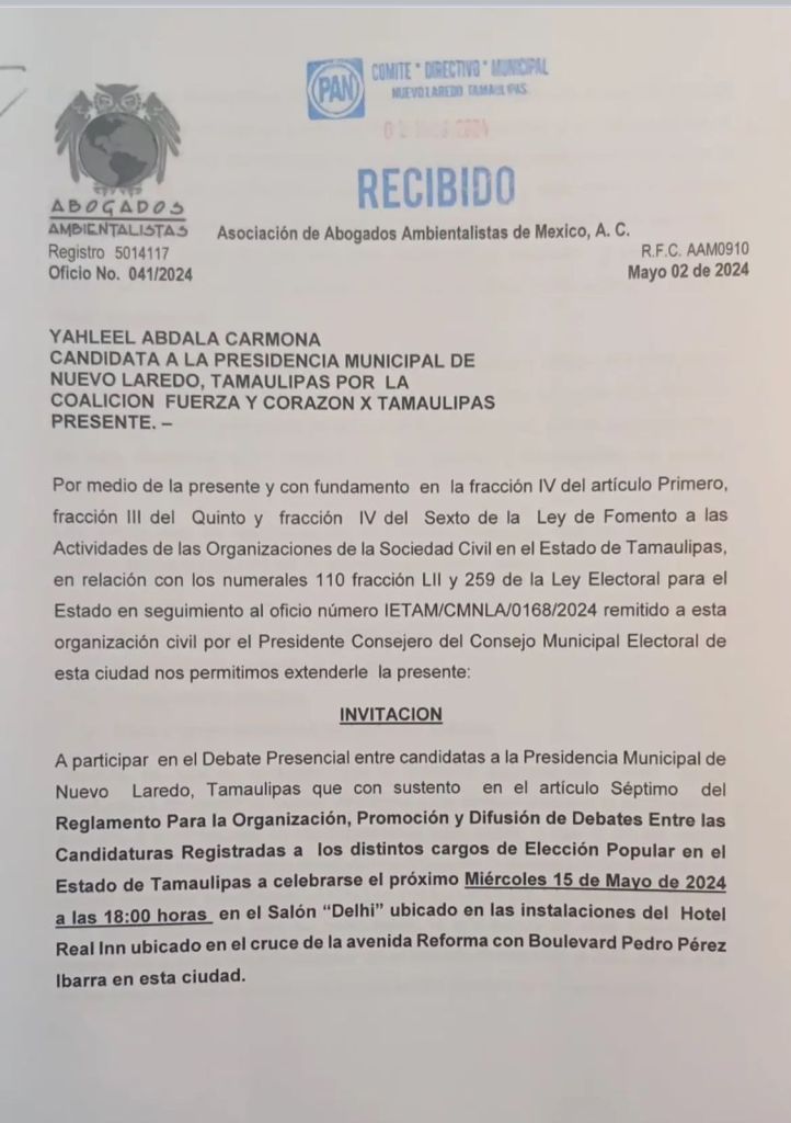 Ricardo Alberto Cruz Haro, dirigente de la institución organizadora del debate, quien obtuvo la aprobación del Consejo Municipal Electoral, para celebrar el ejercicio democrático el 15 de mayo, reveló que la única candidata que aceptó debatir con sus contrincantes es Yahleel Abdala Carmona, abanderada por la coalición PRI-PAN «Fuerza y Corazón por Tamaulipas».