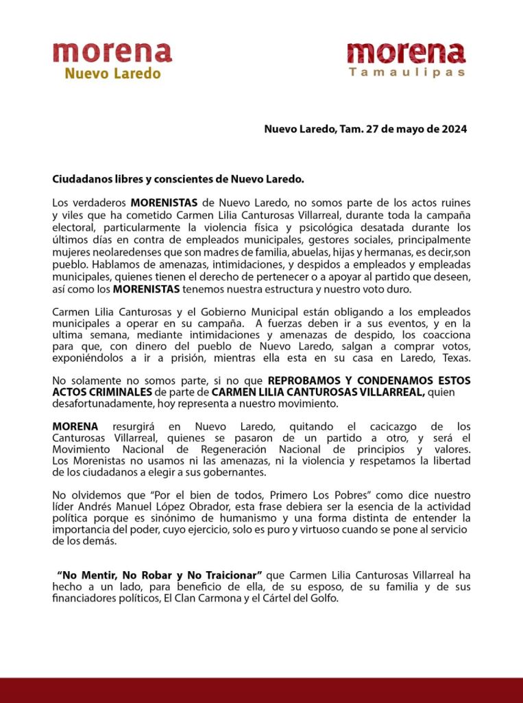 Nuevo Laredo, Tam. 27 de mayo .- En un contundente comunicado emitido hoy, la militancia de MORENA en Nuevo Laredo ha expresado su repudio hacia las acciones perpetradas por la alcaldesa con licencia y candidata a la reelección, Carmen Lilia Canturosas Villarreal.