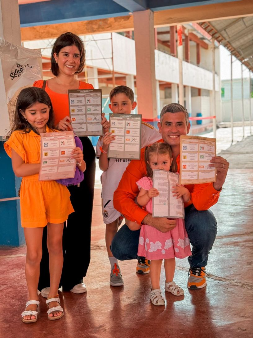 Reynosa, Tamaulipas. Cumpliendo con su derecho ciudadano, el Coordinador Estatal de Movimiento Ciudadano en Tamaulipas, Juan Carlos Zertuche Romero, acudió en compañía de su familia a emitir su voto en la casilla 0979 en la escuela primaria José Pilar Palafox en la colonia Anzaldúas.