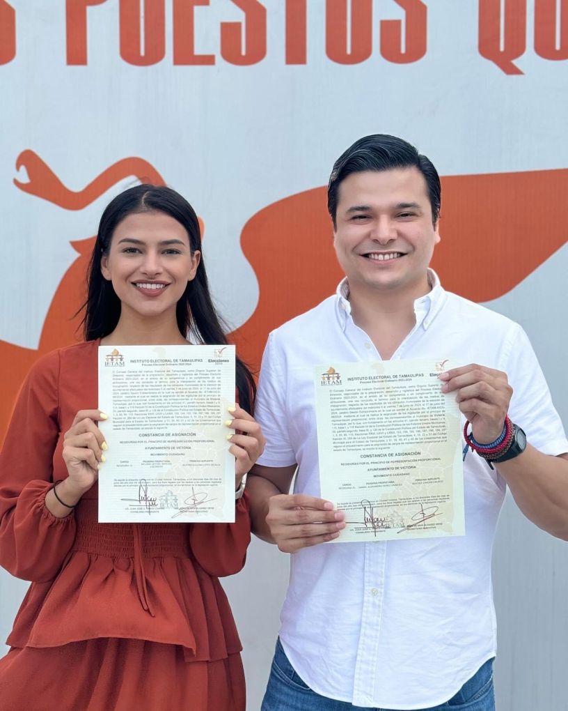 Ciudad Victoria, Tamps.- Luego de los comicios celebrados el pasado 02 de junio, este martes el Instituto Electoral de Tamaulipas entregó a Melissa Mireles y Daniel Pérez sus respectivas constancias que los acreditan como miembros del cabildo de Victoria para la administración que entrará en funciones el próximo mes de octubre, esto acompañados de Luis Tovar Núnez representante de Movimiento Ciudadano ante el consejo general de dicho órgano electoral y de Osberto Vocero digital de coordinación municipal.