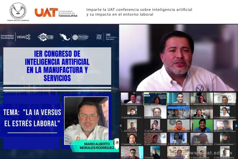 Con su ponencia titulada «La inteligencia artificial contra el estrés laboral”, el Dr. Mario Alberto Morales Rodríguez, docente de la Universidad Autónoma de Tamaulipas, participó en el Primer Congreso de Inteligencia Artificial en la Manufactura y Servicios, organizado por la Universidad Continental de Perú.