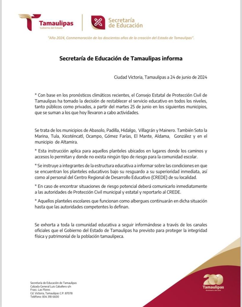 • Con base en los pronósticos climáticos recientes, el Consejo Estatal de Protección Civil de Tamaulipas ha tomado la decisión de restablecer el servicio educativo en todos los niveles, tanto públicos como privados, a partir del martes 25 de junio en los siguientes municipios, que se suman a los que hoy llevaron a cabo actividades.