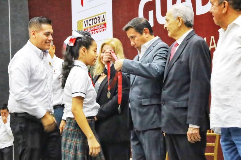 La entrega de medallas al mérito “Guadalupe Victoria” fue para 165 alumnos e igual número de maestros de sexto grado de primaria de los sectores 10, 22, 24 y 39 de Victoria que les reconoce su esfuerzo, valor, dedicación y empeño ejemplar.