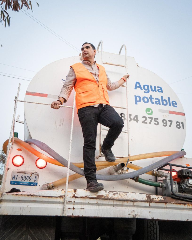 Cd.Victoria, Tam.- Roberto Lee acompañado de la Fuerza Naranja de esta Capital, llevó agua para consumo y servicio doméstico de los hogares al populoso sector Álvaro Obregón, una de las más de 50 colonias que careció del vital líquido este martes.
