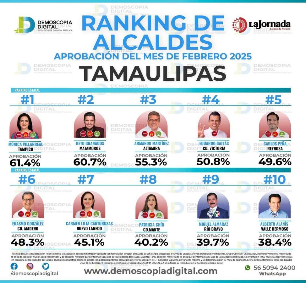 Cd. Victoria, 23 de marzo 2025. – Como resultado de su desempeño al frente de la administración municipal, el Alcalde de Victoria, la Capital de Tamaulipas, Eduardo Gattás Báez se ubicó entre los presidentes municipales mejor evaluados de Tamaulipas.