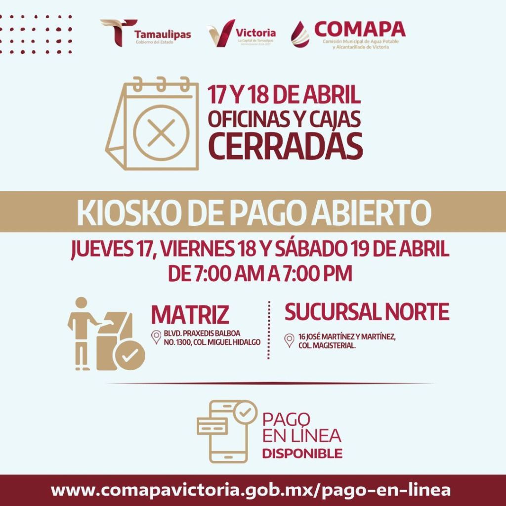 Ciudad Victoria, Tamaulipas, a 16 de abril de 2025. – La Comisión Municipal de Agua Potable y Alcantarillado de Victoria (COMAPA Victoria) informa a la ciudadanía que, con motivo del periodo de Semana Santa, sus oficinas para cobro, trámites y atención a usuarios permanecerán cerradas los días jueves 17 y viernes 18 de abril de 2025.