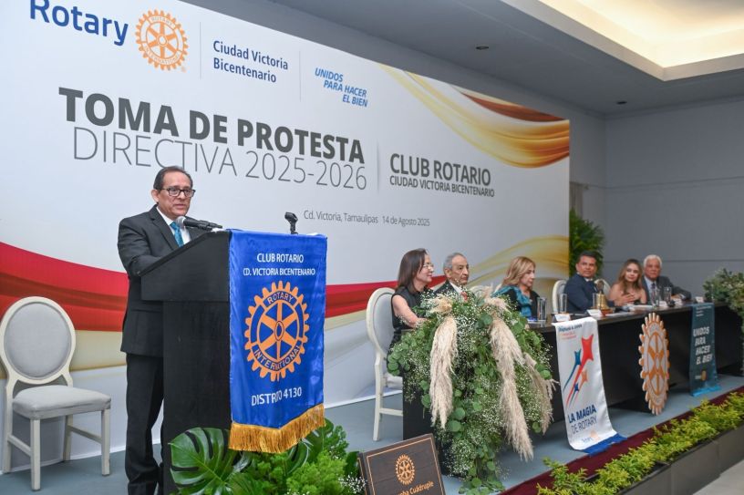 Cd. Victoria, 16 de agosto 2025. – Al asistir a la toma de protesta de la nueva mesa directiva del Club Rotario Ciudad Victoria Bicentenario, el presidente municipal Eduardo Gattás Báez reconoció y elogió su trabajo altruista que han realizado a lo largo de 15 años, en beneficio de la comunidad.