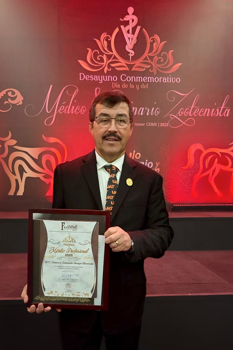 El rector de la Universidad Autónoma de Tamaulipas (UAT), Dámaso Anaya Alvarado, fue galardonado con el Premio al Mérito Profesional 2025, otorgado por la Federación de Colegios y Asociaciones de Médicos Veterinarios de México A. C. (FedMVZ), en reconocimiento a su trayectoria profesional y aportaciones al sector veterinario.