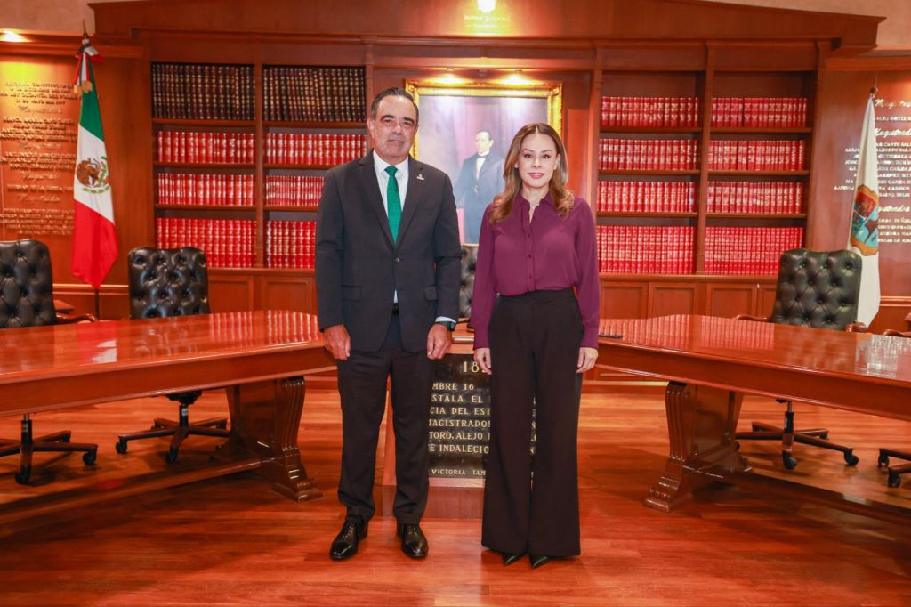 El Magistrado Hernán de la Garza Tamez, Presidente del Supremo Tribunal de Justicia y del Consejo de la Judicatura del Estado de Tamaulipas, recibió a la Magistrada electa, Tania Contreras López, con quien sostuvo la primera reunión de trabajo, donde se presentaron los comités de transición para iniciar este ejercicio administrativo y legal.