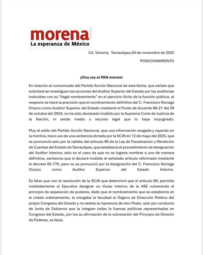 Muy al estilo del Partido Acción Nacional, que usa información sesgada y rayando en la mentira, hace uso de una sentencia dictada por la SCJN en 12 de mayo del 2025, que se pronunció solo por la validez del artículo 89 de la Ley de Fiscalización y Rendición de Cuentas del Estado de Tamaulipas, que establecía el procedimiento de designación del Auditor Interino, solo en el caso de que no se lograra nombrar a uno de manera definitiva, sentencia que si declaró inválido el señalado artículo reformado mediante el decreto 65-776, pero no se pronunció por la designación del C. Francisco Noriega Orozco como Auditor Superior del Estado Interino.
