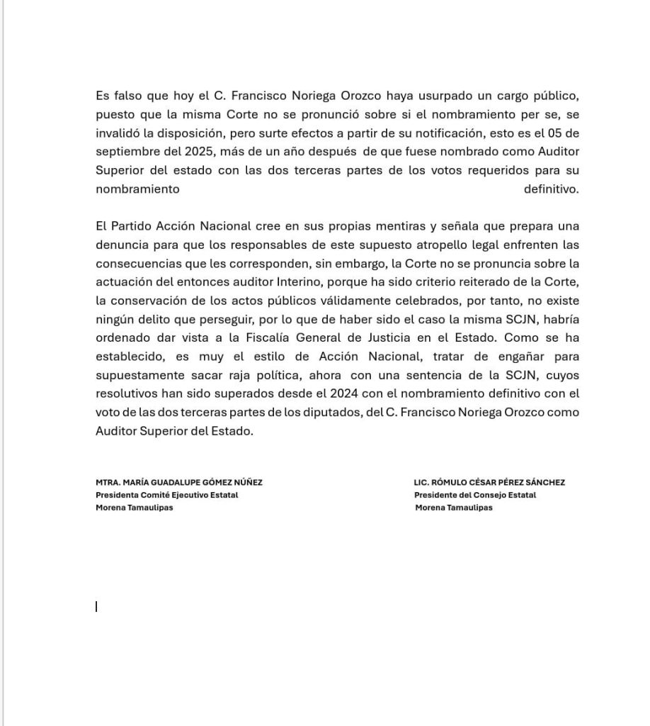 En relación al comunicado del Partido Acción Nacional de esta fecha, que señala que solicitará se investiguen las acciones del Auditor Superior del Estado por las auditorias instruidas con su “ilegal nombramiento” en el ejercicio ilícito de la función pública, al respecto se hace la precisión que el nombramiento definitivo del C. Francisco Noriega Orozco como Auditor Superior del Estado mediante el Punto de Acuerdo 66-21 del 29 de octubre del 2024, no ha sido declarado inválido por la Suprema Corte de Justicia de la Nación, ni existe medio o recurso legal que lo haya impugnado.