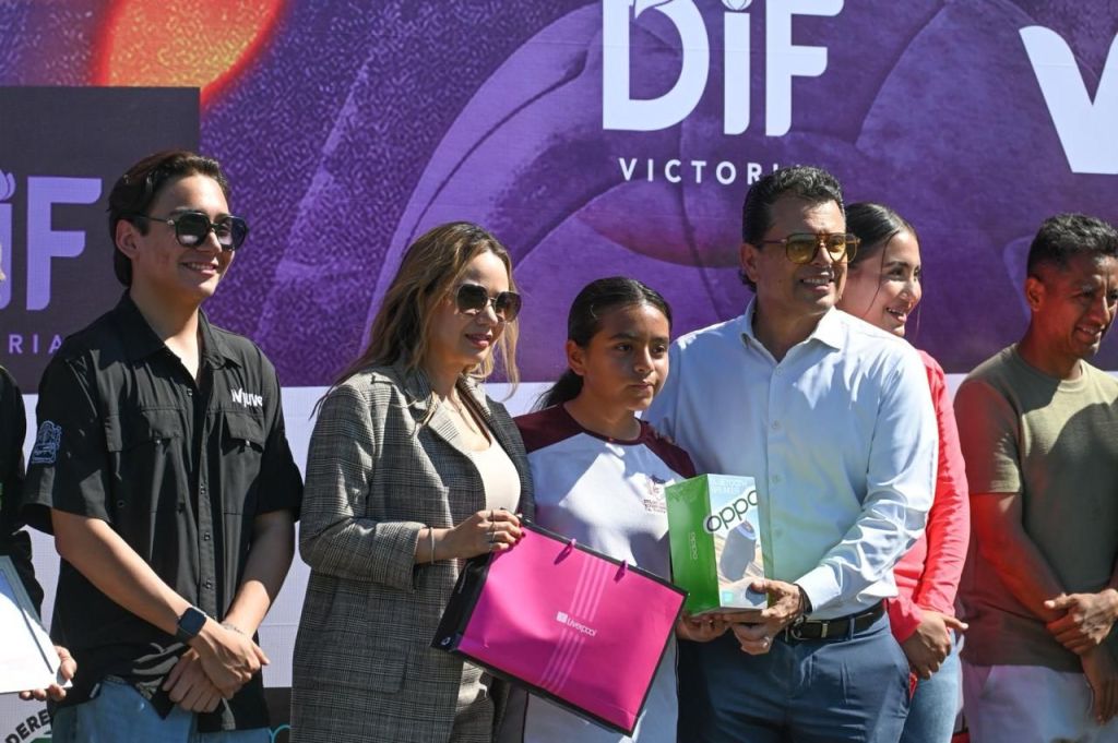 La presidenta del Sistema DIF, Lucy de Gattás, y el alcalde de Victoria, Eduardo Gattás Báez, presidieron la ceremonia de clausura en la cancha Enrique Borja, donde entregaron premio de primer lugar a los equipos, femenil y varonil, de la Secundaria Rafael Ramírez.