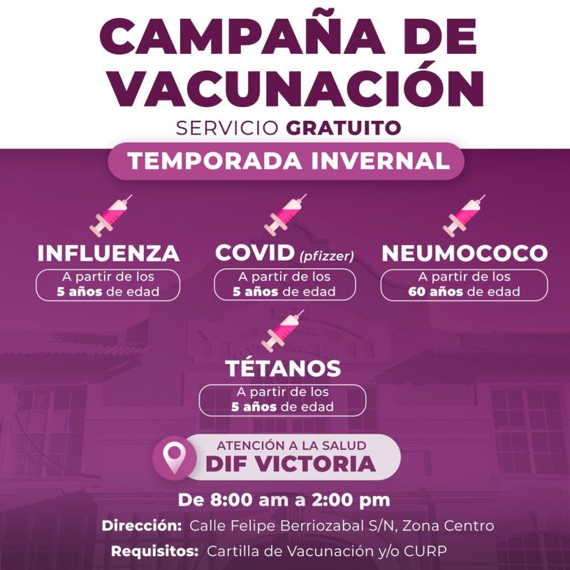 Cd. Victoria, 12 de noviembre 2025. – Con el propósito de cuidar la salud de las familias victorenses durante la temporada invernal, el Sistema DIF Victoria y su Presidenta Lucy de Gattás, invita a la población a participar en su Campaña de Vacunación Gratuita, disponible en el área de Atención a la Salud.
