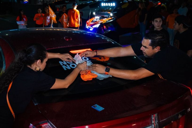 Matamoros, Tam.- Se logró una gran convocatoria de voluntarios y coches de todo tipo que portan ahora la calca «Nuevo Norte», slogan que promociona Movimiento Ciudadano a través de su dirigente Roberto Lee, que estuvo acompañado de su familia, equipo de trabajo y muchos entusiastas matamorenses que se sumaron a esta tarde noche de alegría y efervecencia partidista.