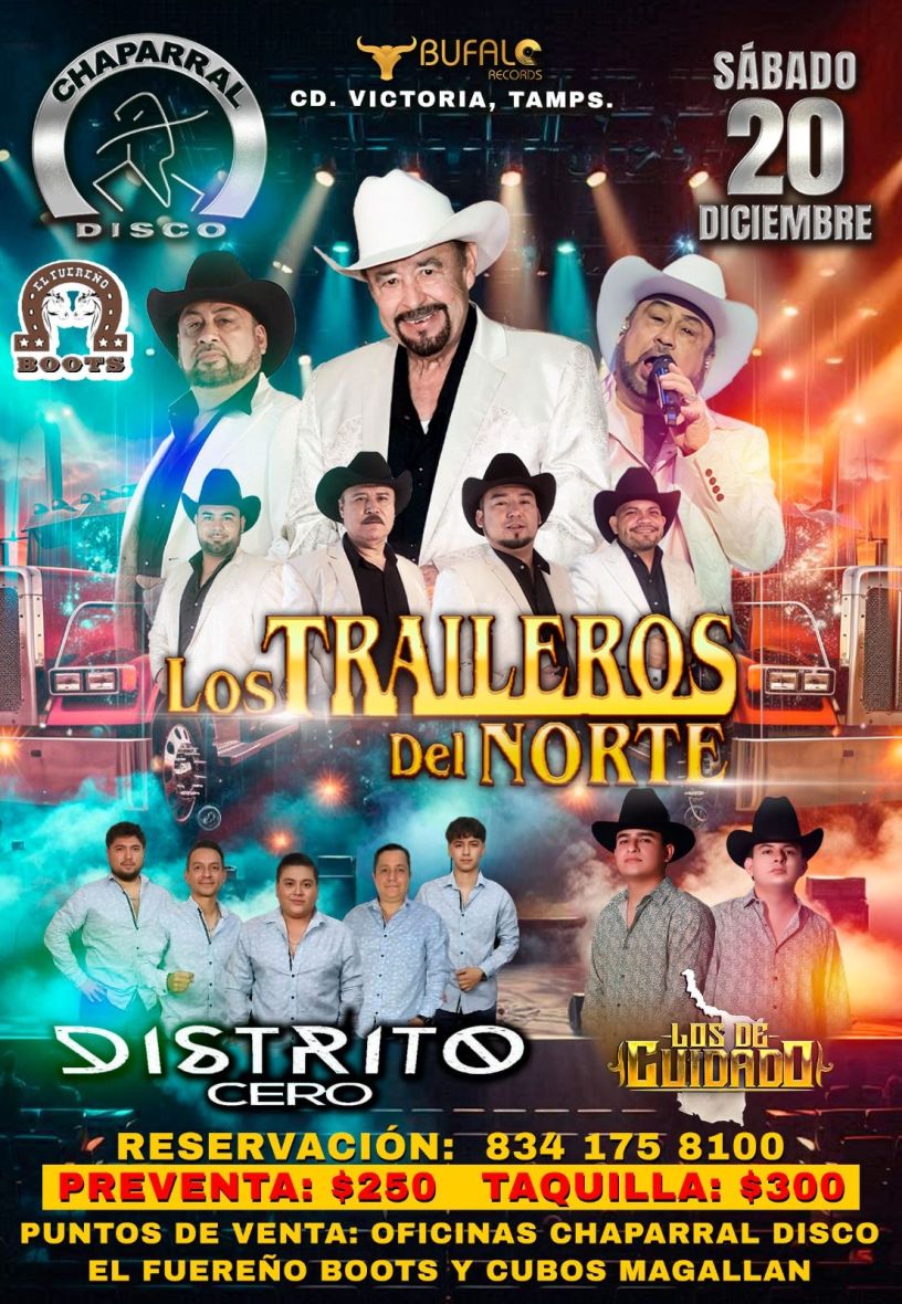 🔥 Sábado 2️⃣0️⃣ de Diciembre, llegan los caballeros del estilo diferente LOS TRAILEROS DEL NORTE con sus grandes éxitos como Abeja reina, Rosas blancas, Ni tú amigo ni tu amante y más podrás disfrutar en el Chaparral Oficial Cd Victoria :