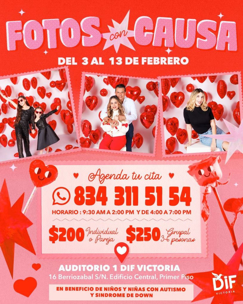 Del 3 al 13 de febrero, las personas podrán acudir con su pareja, familia o amigos y tomarse 3 fotografías profesionales de estudio en un set especial, ubicado en el Auditorio 1 del DIF Victoria, dentro del edificio central.