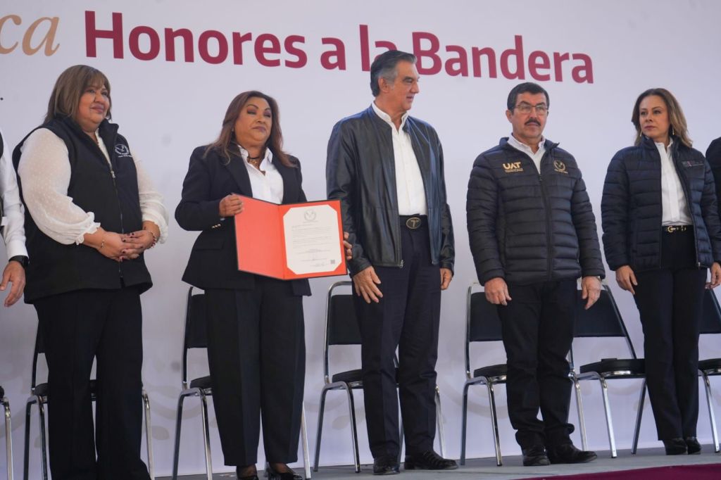 El gobernador Américo Villarreal Anaya, junto con el rector de la Universidad Autónoma de Tamaulipas (UAT), Dámaso Anaya Alvarado, encabezó este lunes la ceremonia de honores a la bandera y atestiguó la toma de protesta de la Dra. María Guadalupe Vázquez Salazar como directora de la Facultad de Enfermería Victoria para el periodo 2026-2029.