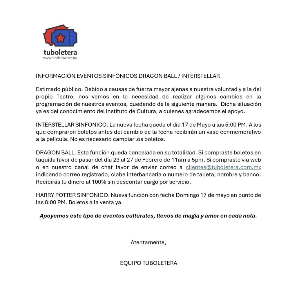 En cambio, la función de Dragon Ball está cancelada. Si compraste boletos en taquilla favor de pasar del día 23 al 27 de febrero de 11:00 a.m. a 5:00 p.m.