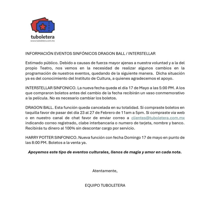 La fecha programada para el domingo 15 de febrero para el evento de INTERSTELLAR SINFÓNICO, se cambia para el domingo 17 de mayo a las 5:00 p.m. debido a causas ajenas.