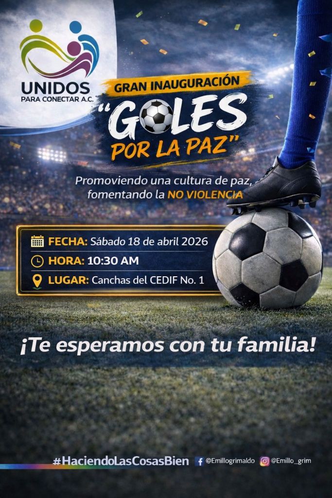 Este sábado se realizará el torneo deportivo Goles por la Paz, «Promoviendo una cultura de paz y no violencia a través del deporte» el cual es organizado por la Asociación Unidos para Conectar A. C, mismo que se desarrollará en las Canchas del CEDIF UNO, con la participación de ocho equipos en categoría libre juvenil.