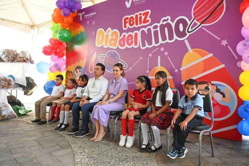 Cd. Victoria, 30 de abril de 2026.- En el marco de los festejos del Día del Niño y la Niña, la presidenta del Sistema DIF Lucy de Gattás y el alcalde de Victoria Eduardo Gattás Báez, organizaron alegre convivio a alumnos de jardines, escuelas primarias y asociaciones civiles.